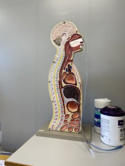Our Sim Lab is home to a number of mannequins that stand-in for real life patients. High fidelity mannequins, two adults and a child, can replicate real medical emergencies like seizures and can “speak” to students via a control panel. Professors can create scenarios and verbally list symptoms to test student skills. The medium fidelity mannequins – a mother and infant – can simulate the process of childbirth when operated by professors. Four low fidelity mannequins help students test their skills with tracheotomies, NG tubs, catheters, and moving patients.